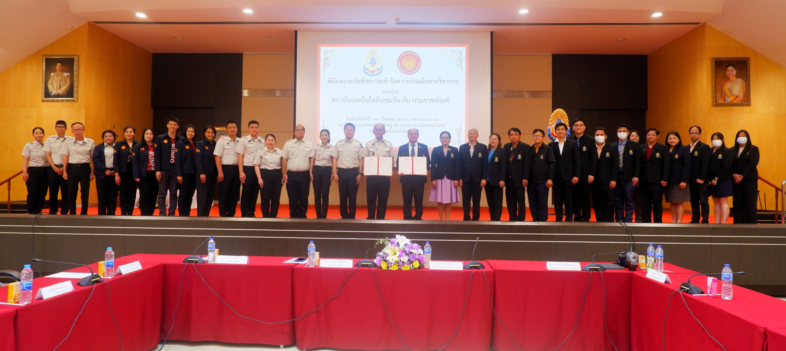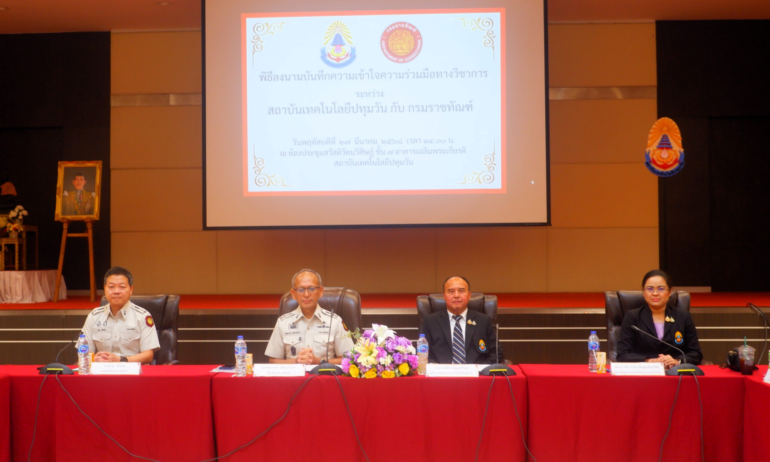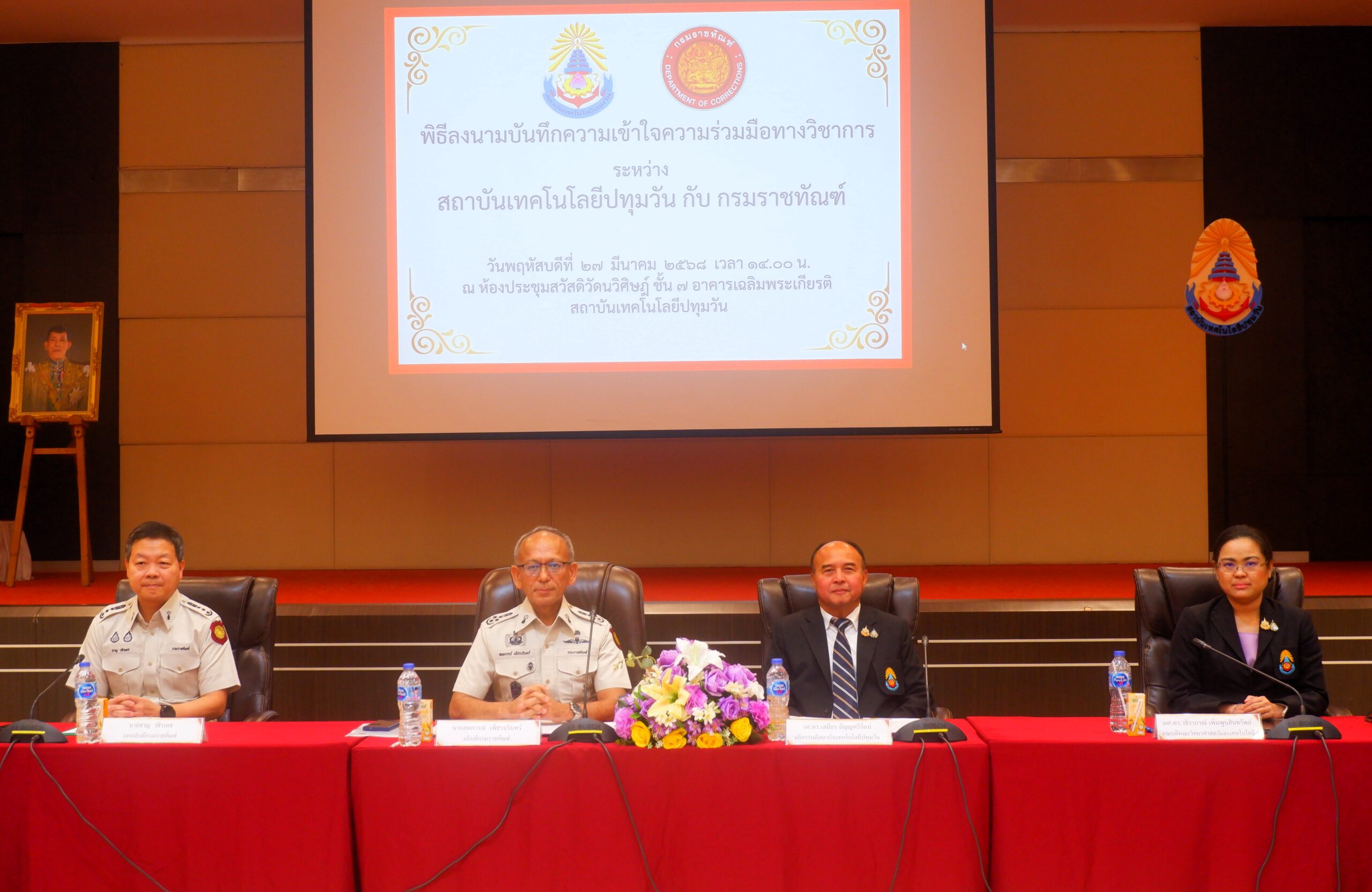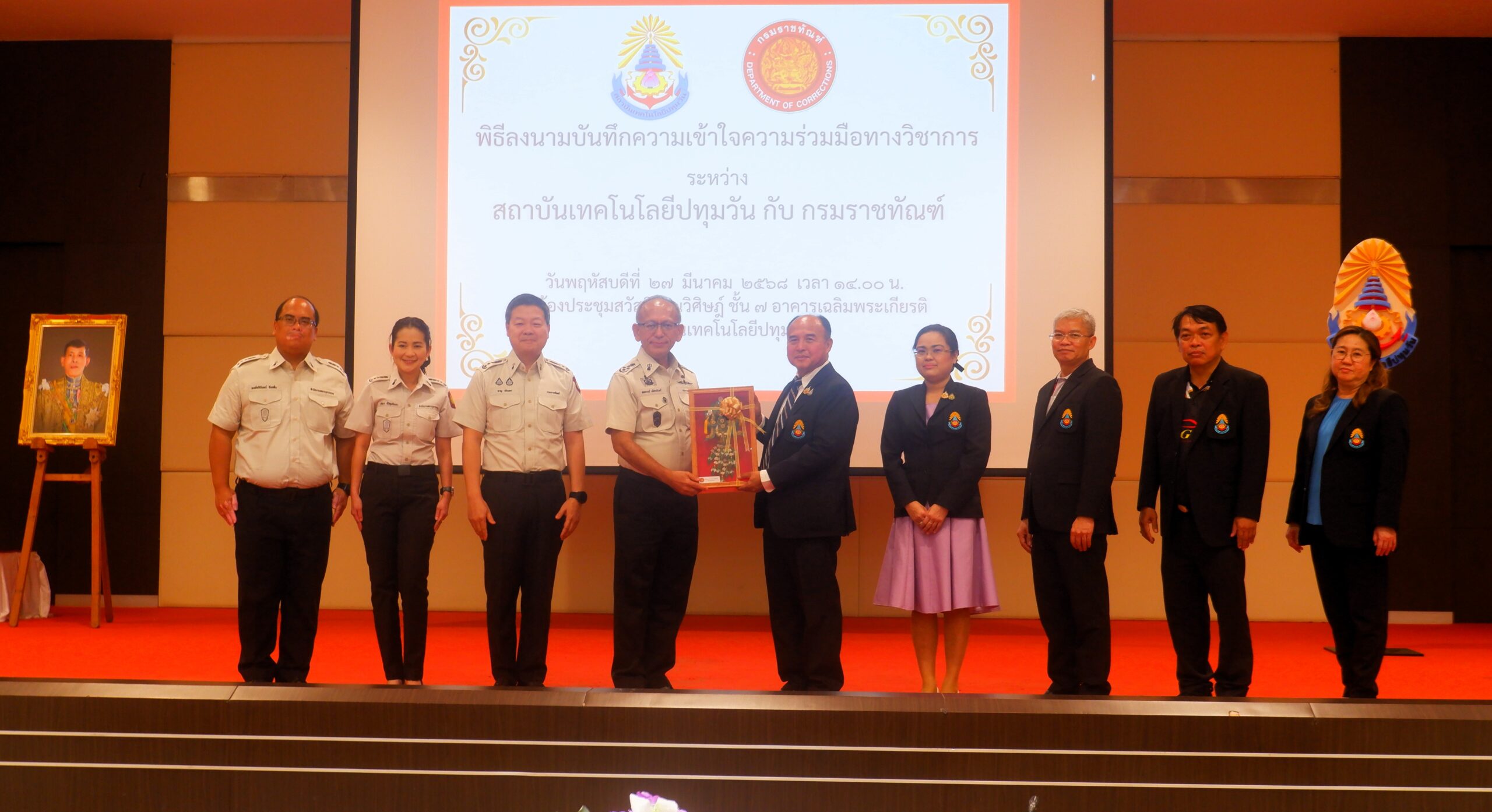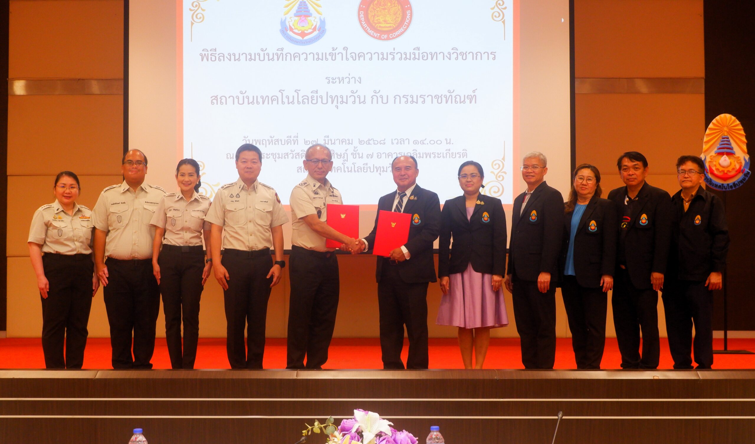 วันพฤหัสบดีที่ 27 มีนาคม พ.ศ. 2568 ณ ห้องประชุมสวัสดิวัดนวิศิษฎ์ ชั้น 7 อาคารเฉลิมพระเกียรติ สถาบันเทคโนโลยีปทุมวัน โดย รองศาสตราจารย์ ดร.เสถียร ธัญญศรีรัตน์ อธิการบดี สถาบันเทคโนโลยีปทุมวัน ผู้ช่วยศาสตราจารย์ วีนัส ทัดเนียม รองอธิการบดี อาจารย์จิตรภรณ์ นางทิน รองอธิการบดี ผู้ช่วยศาสตราจารย์ ดร.วชิราภรณ์ เพิ่มพูนสินทรัพย์ คณบดีคณะวิทยาศาสตร์และเทคโนโลยี ผู้ช่วยศาสตราจารย์ ดร.ประสิทธิ์ นางทิน คณบดีคณะวิศวกรรมศาสตร์ พร้อมด้วยคณะผู้บริหาร คณาจารย์และบุคลากร สถาบันเทคโนโลยีปทุมวัน ให้การต้อนรับ นายสหการณ์ เพ็ชรนรินทร์ อธิบดีกรมราชทัณฑ์ นายชาญ วชิรเดช รองอธิบดีกรมราชทัณฑ์ พร้อมคณะ ในพิธีลงนามบันทึกความเข้าใจความร่วมมือทางวิชาการ ระหว่าง สถาบันเทคโนโลยีปทุมวัน กับ กรมราชทัณฑ์