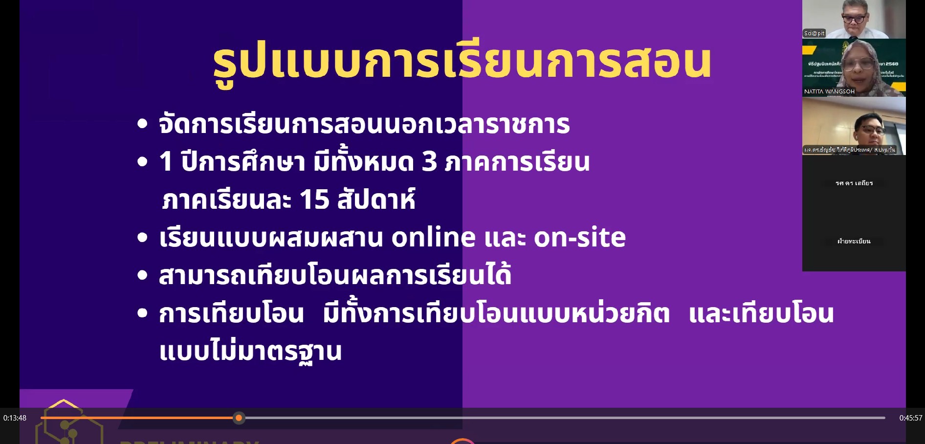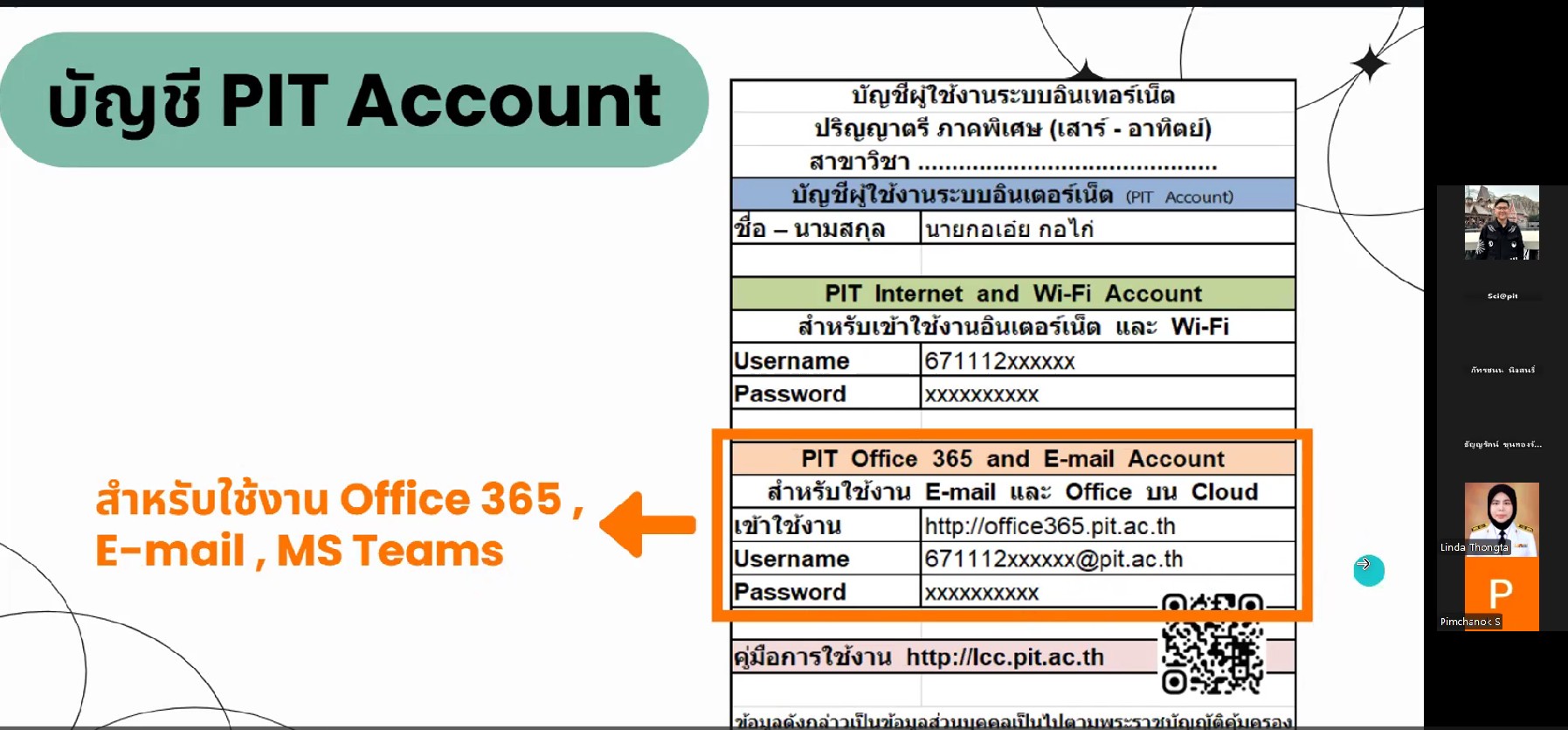 หลังพิธีเปิด ได้รับเกียรติจาก นางสาวอารีรัตน์ ยศนันท์ นักวิชาการศึกษา มาให้ความรู้เกี่ยวกับการลงทะเบียนเรียน และการเข้าใช้งานของฝ่ายทะเบียนและวัดผลการศึกษา และนางสาวลินดา ทองทา นักเทคโนโลยีสารสนเทศ มาให้ความรู้เกี่ยวกับการเข้าใช้งานศูนย์ภาษาและคอมพิวเตอร์
