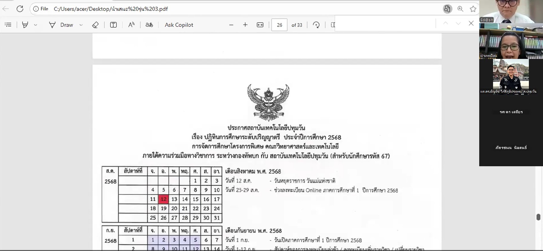 วันพฤหัสบดีที่ 28 สิงหาคม พ.ศ. 2568 คณะวิทยาศาตร์และเทคโนโลยี สถาบันเทคโนโลยีปทุมวัน จัดงานปฐมนิเทศนักศึกษาใหม่ ระดับปริญญาตรี ประจำปีการศึกษา 2568 การจัดการโครงการพิเศษคณะวิทยาศาสตร์และเทคโนโลยี ภายใต้ความร่วมมือทางวิชาการ ระหว่าง กองทัพบก กับ สถาบันเทคโนโลยีปทุมวัน โดยมีผู้บริหาร คณาจารย์ จากคณะวิทยาศาสตร์และเทคโนโลยี ร่วมพิธีปฐมนิเทศในครั้งนี้ ซึ่งพิธีปฐมนิเทศจัดในรูปแบบออนไลน์ ผ่านระบบ Zoom Meeting